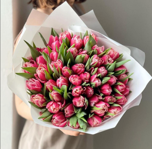 Состав: - Тюльпан пионовидный 55 шт - Упаковка 3 м - Бесплатная открытка - Бесплатная доставка ( цвет букета может отличаться от представленного на изобретении)