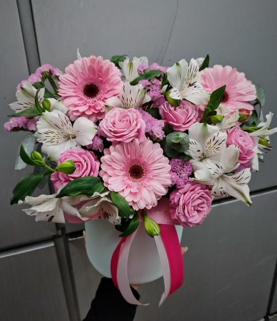 Состав: - Гербера 3 шт - Альстромерия 3 шт - Роза кустовая 2 шт - Старица 2 шт - Коробка шляпная - Оазис 1 шт