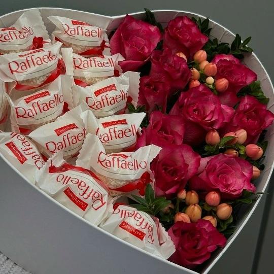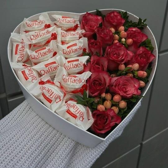 Роза 40 см 11 шт Raffaello 13 шт Гиперикум 1 шт Самшит 1 шт Коробка сердце 1 шт Оазис 1 шт Упаковка 1 м
