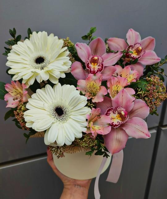 Состав: - Гербера - 2 шт - Альстромерия - 2 шт - Орхидея - 3 шт - Самшит/ Рускус - 2 шт - Оазис - Коробка шляпная