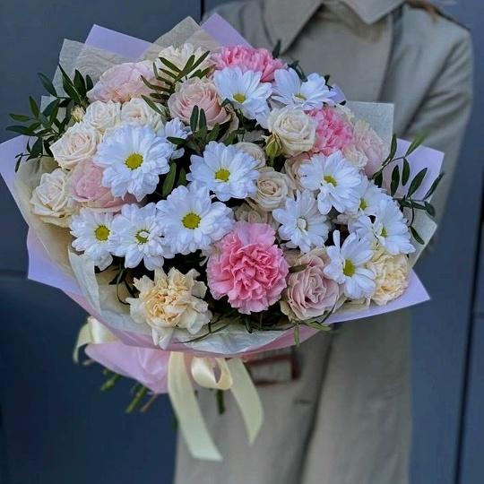 Состав: - Хризантема кустовая 3 шт - Роза кустовая 4 шт - Диантус сортовой 6 шт - Роза одноголовая 50 см 5 шт - Самшит/ Фисташка 3 шт - Упаковка 3 м